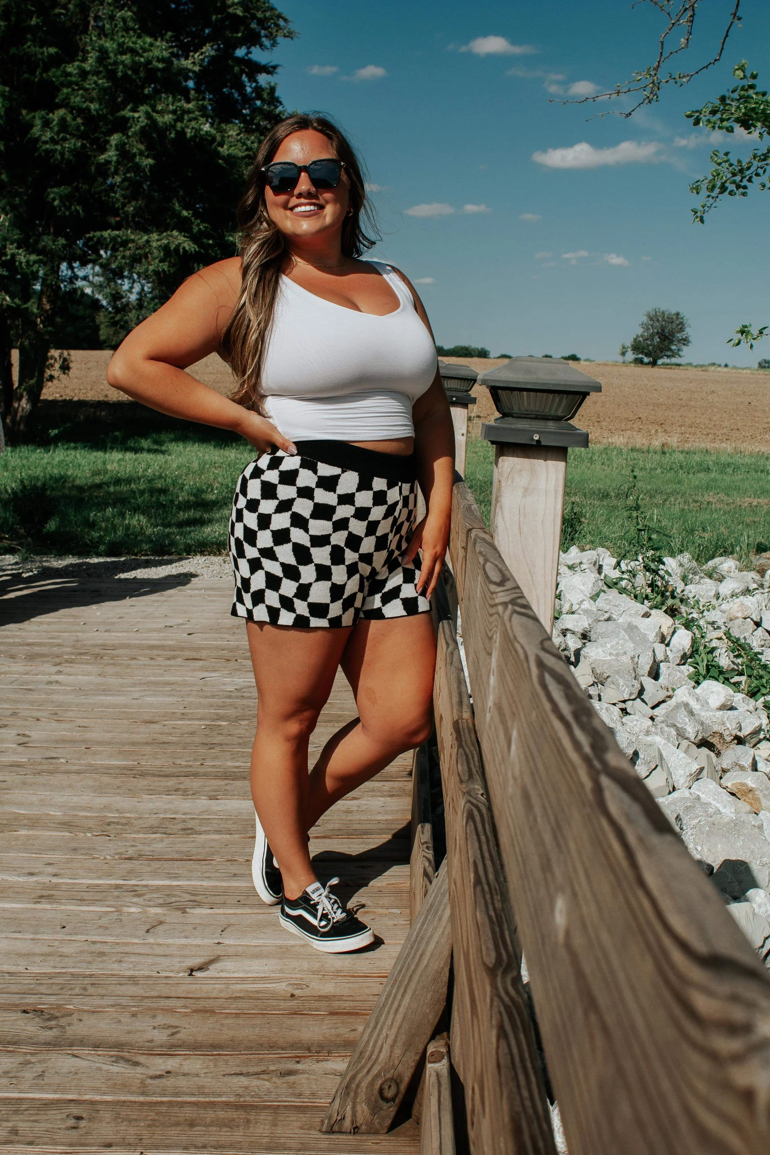 This tank is SO comfortable & stylish! We LOVE the tie straps & the summery colors throughout this tank. Bust area has maximum stretch! Paired with our high rise mom shorts :)